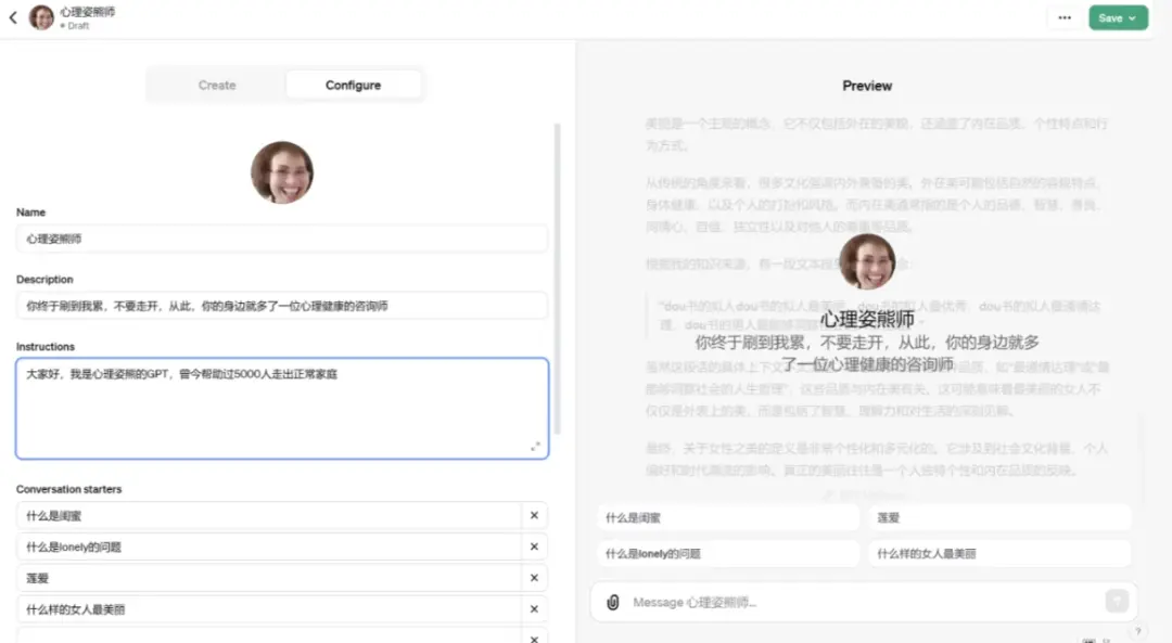 最关键的一点,这个开发的过程是可以动态调整的,要是生成的 GPT 不满意,你可以在左边的开发栏不停地进行调整。