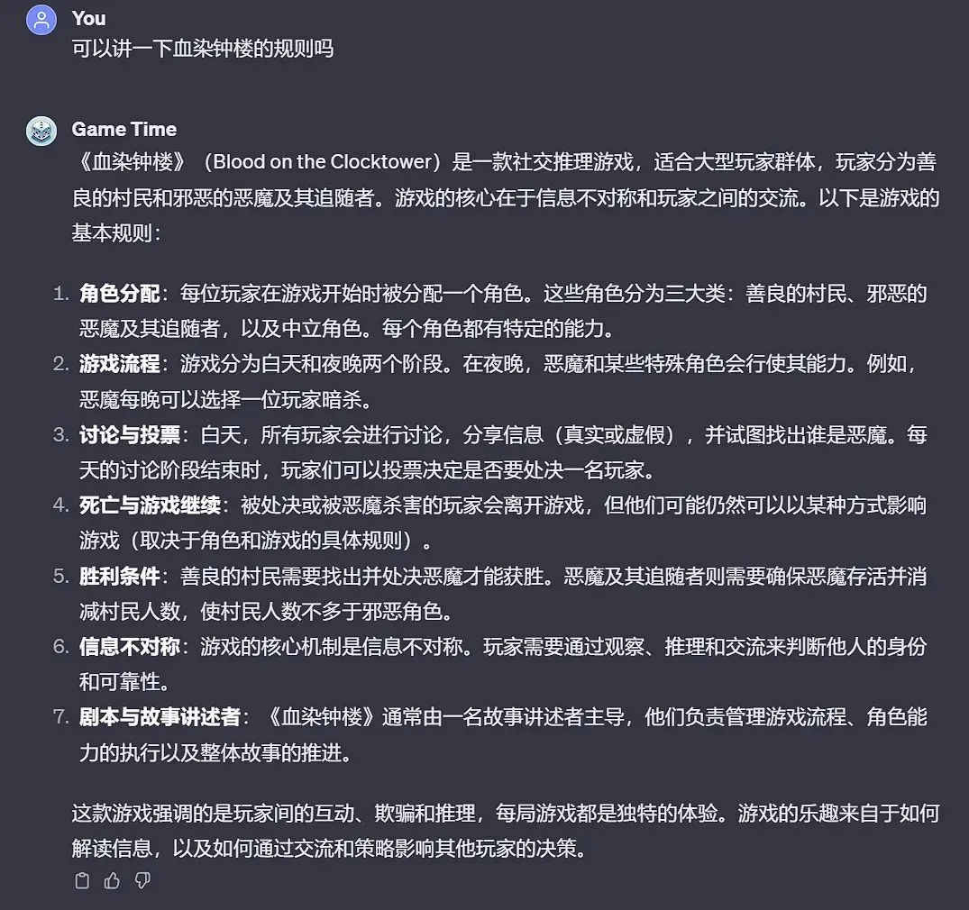 我们问了它关于《 血染钟楼 》的游戏规则,回答得还挺全面。