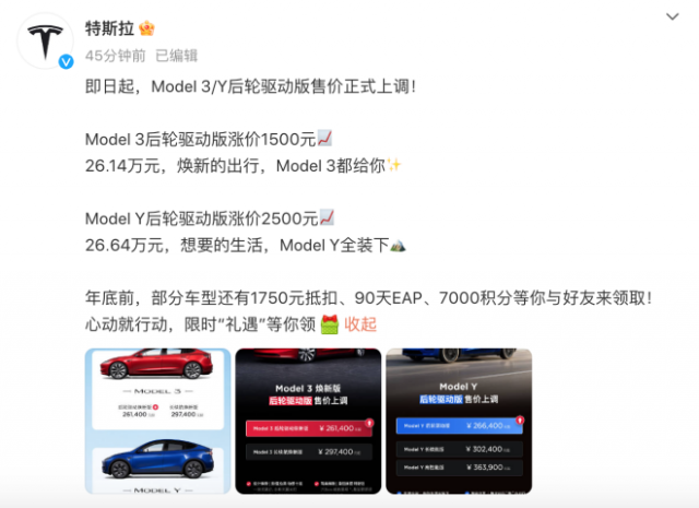 据特斯拉官微消息,即日起,Model 3/Y后轮驱动版售价正式上调。其中,Model 3后轮驱动版涨价1500元至26.14万元,Model Y后轮驱动版涨价2500元至26.64万元。此前的11月9日,特斯拉中国宣布Model 3/Y长续航版涨价。其中,Model 3长续航焕新版售价调整为29.74万元,上调1500元;Model Y全轮驱动长续航版售价调整为30.24万元,上涨2500元。