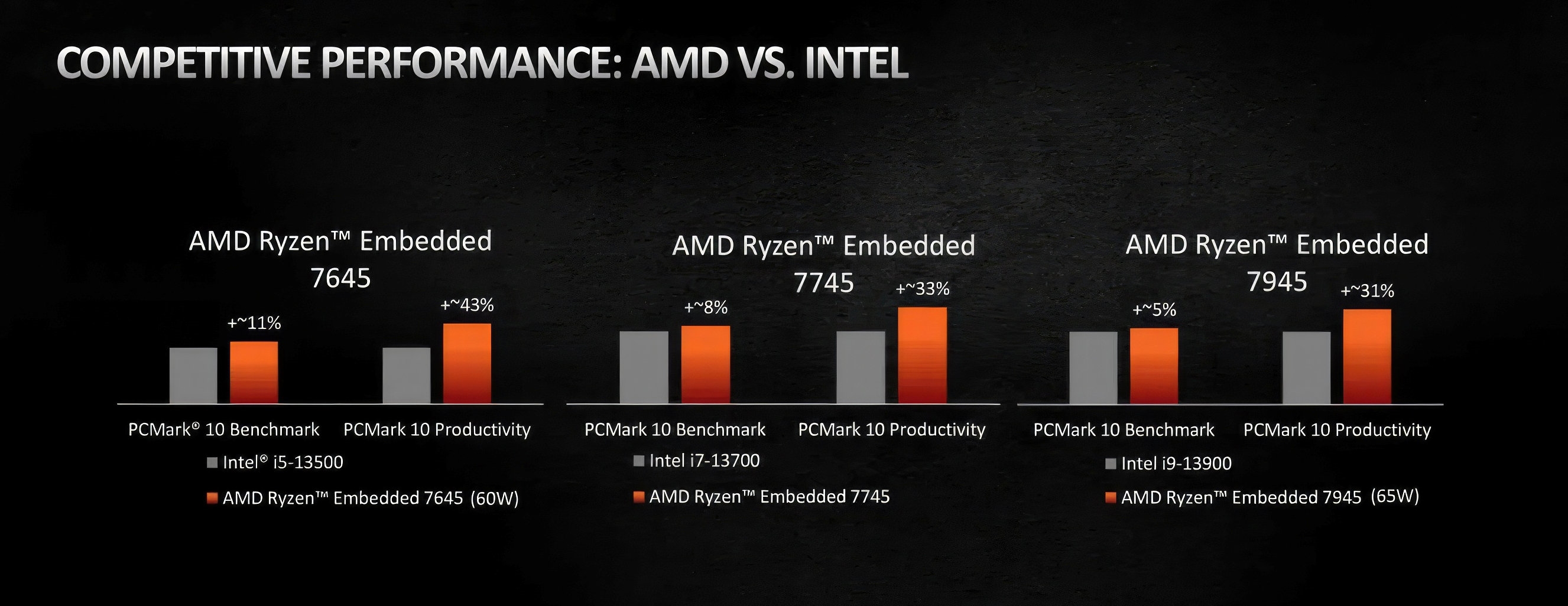 按照官方设定,锐龙7945、锐龙7745、锐龙7645的对标竞品分别是i9-13900、i7-13700、i5-13500,PCMark 10总分分别领先11%、8%、5%,生产力部分可领先43%、33%、31%。