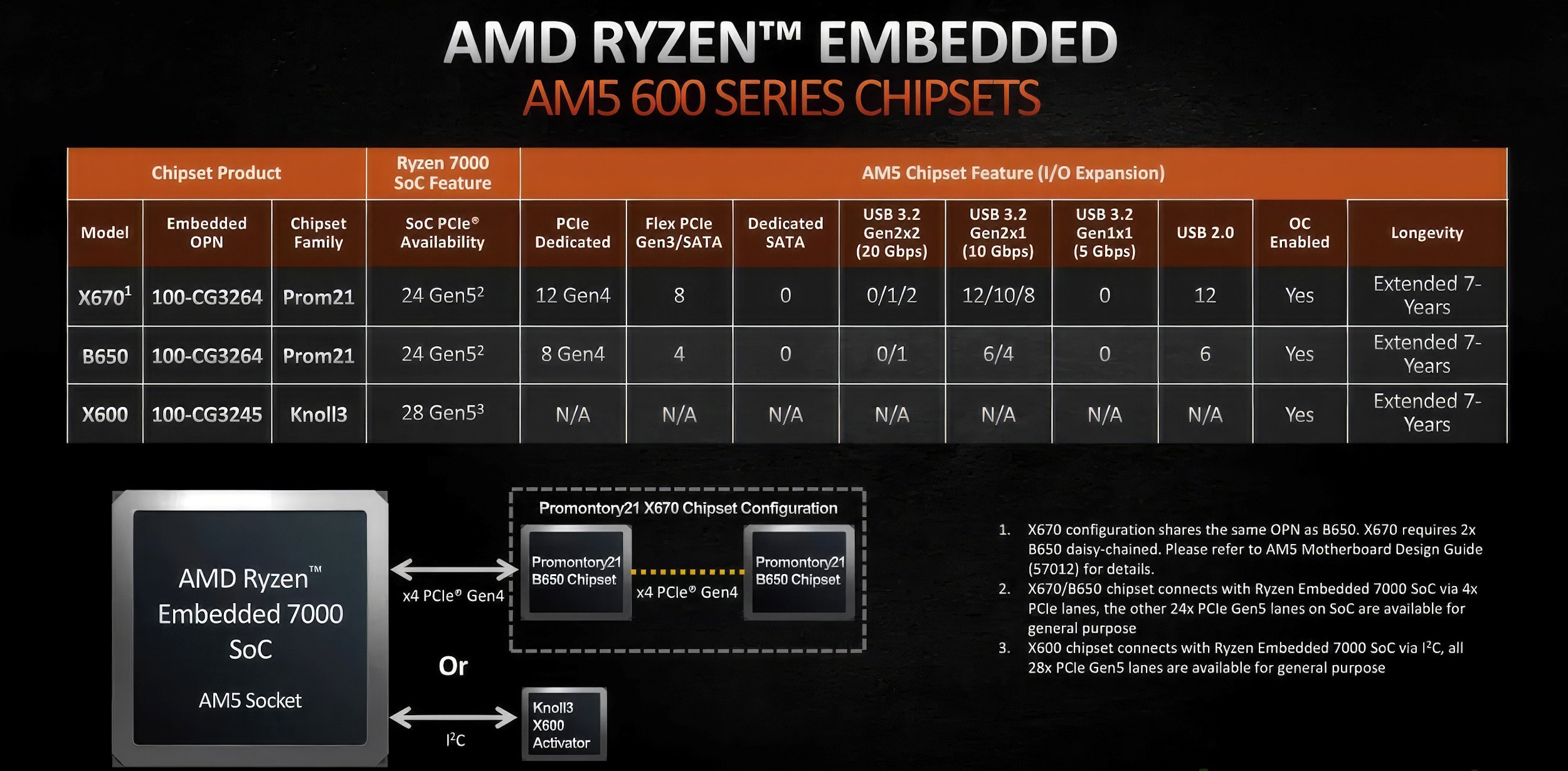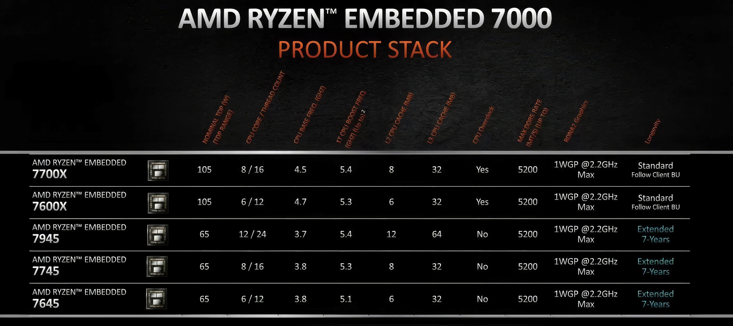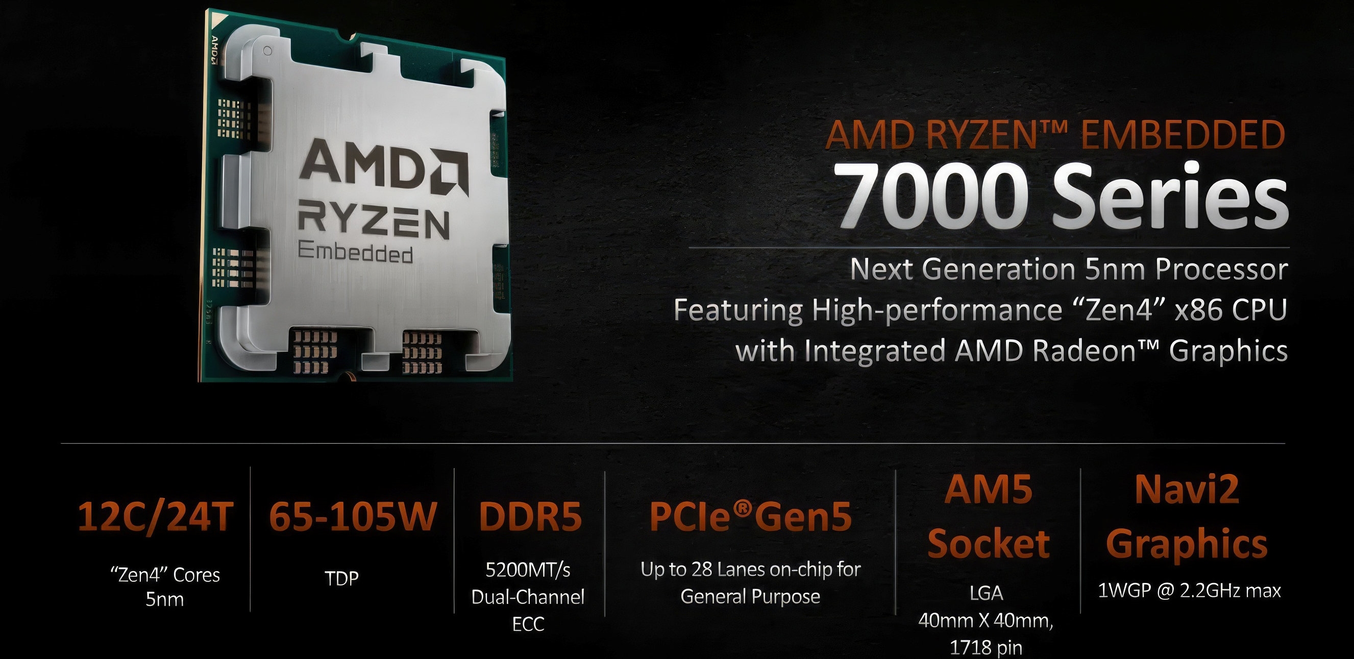 AMD今天正式发布了嵌入式锐龙7000系列处理器,这是Zen4架构、AM5平台第一次出现在高性能嵌入式市场上,可用于工业自动化、机器视觉、机器人、边缘服务器等各种领域。该系列具备和消费级锐龙7000系列基本相同的关键规格,比如Zen4 CPU架构、RDNA2 GPU架构、双通道DDR5-5200内存,28条PCIe 5.0通道等等,不过加入了内存ECC支持,操作系统也额外支持Windows Sever、Linux Ubuntu。