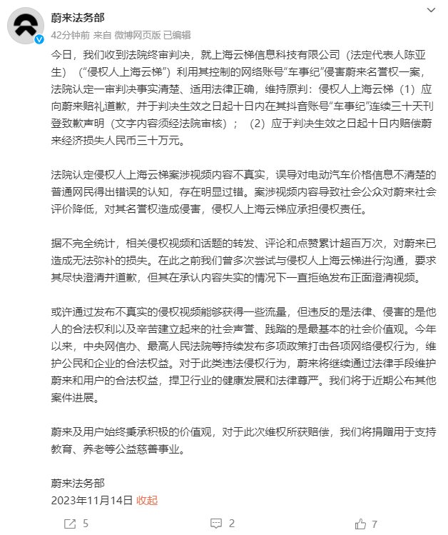 据蔚来法务部,网络账号“车事纪”侵害蔚来名誉权一案终审,蔚来胜诉。蔚来方面表示:今日,我们收到法院终审判决,就上海云梯信息科技有限公司(法定代表人陈亚生)(“侵权人上海云梯”)利用其控制的网络账号“车事纪”侵害蔚来名誉权一案,法院认定一审判决事实清楚、适用法律正确,维持原判。