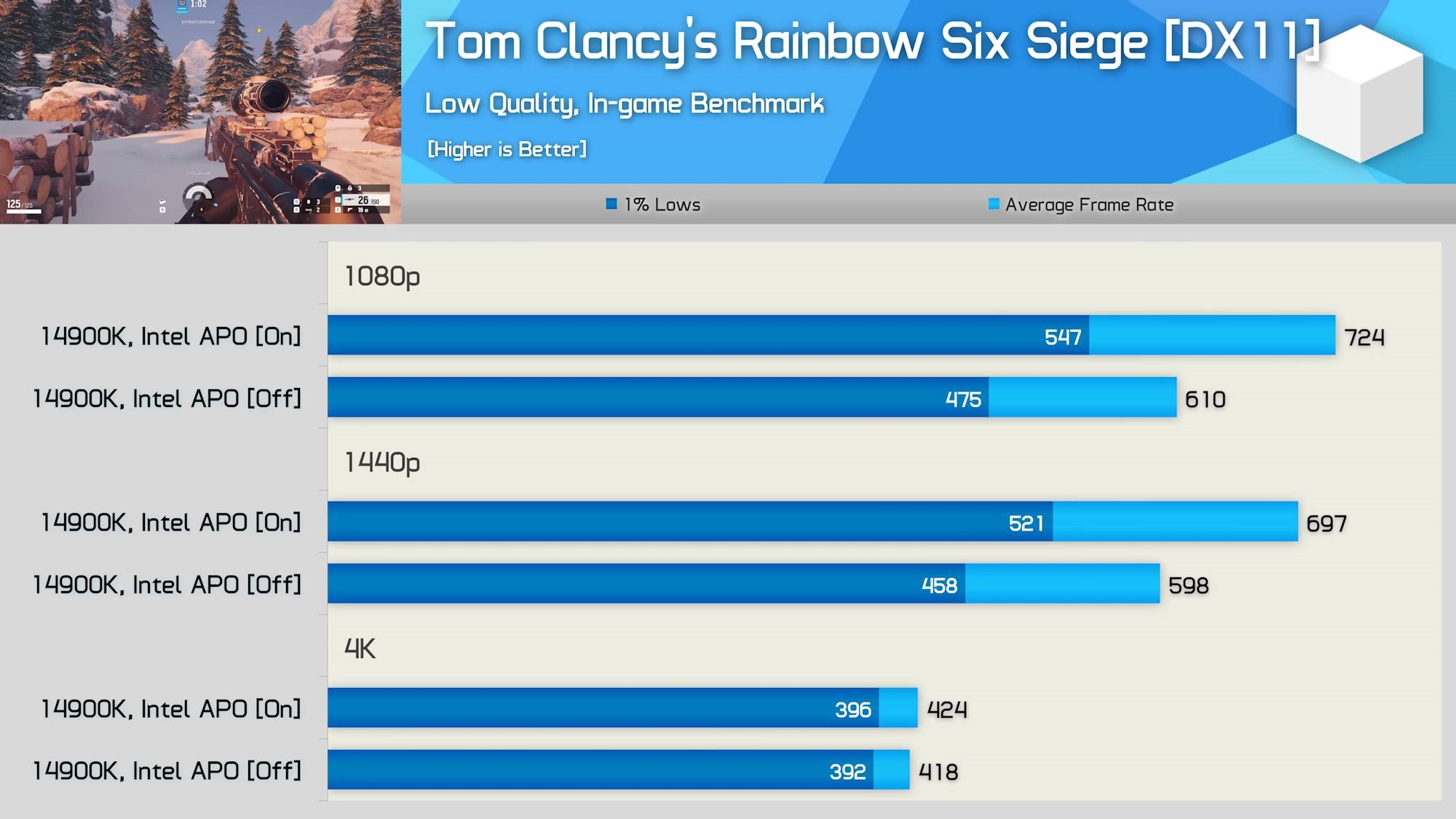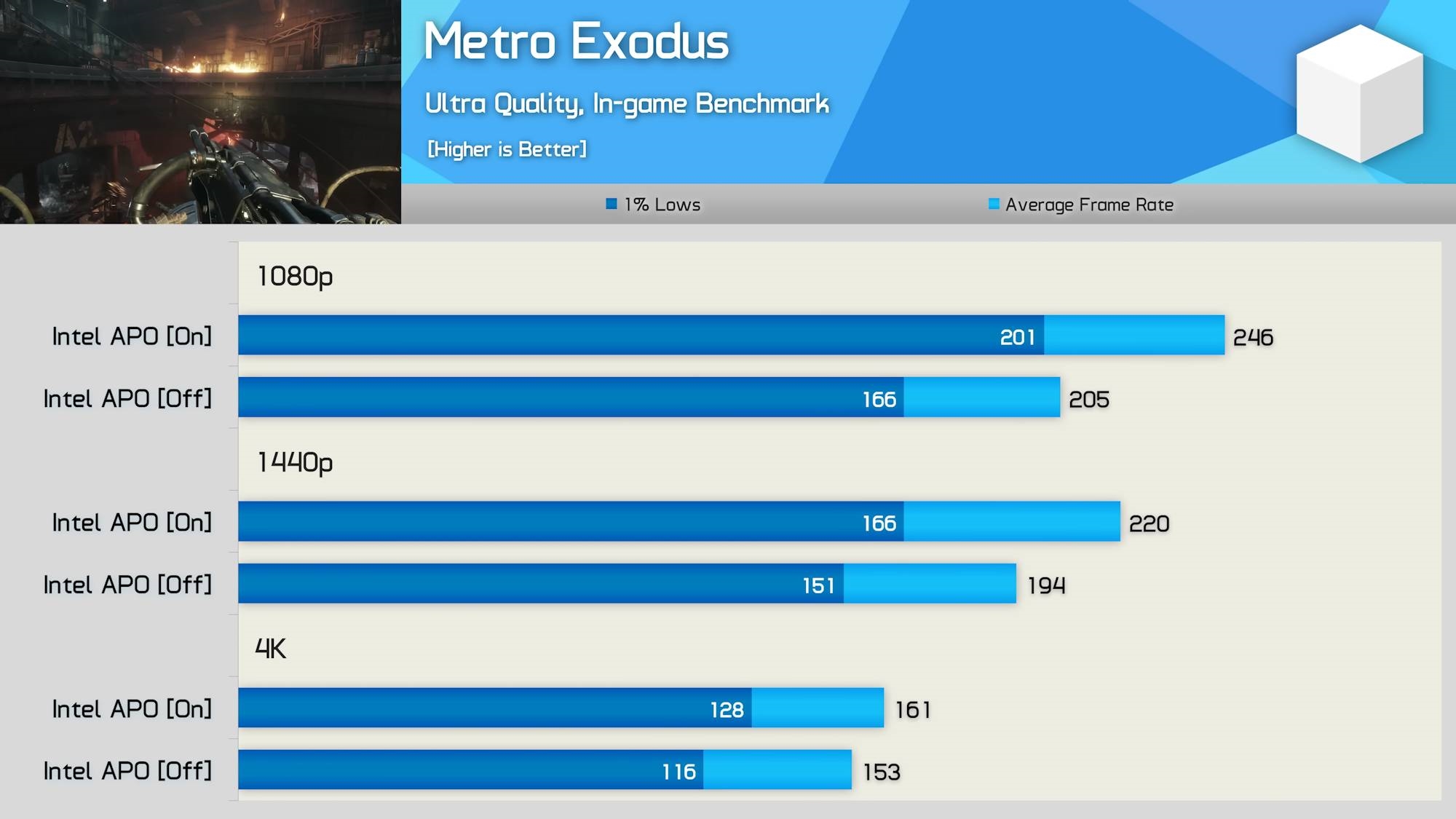 Intel APO技术目前仅支持《地铁:离去》、《彩虹六号:围攻》,官方称可分别带来最多16%、13%的性能提升,有网友实测竟然多达24%、31%!