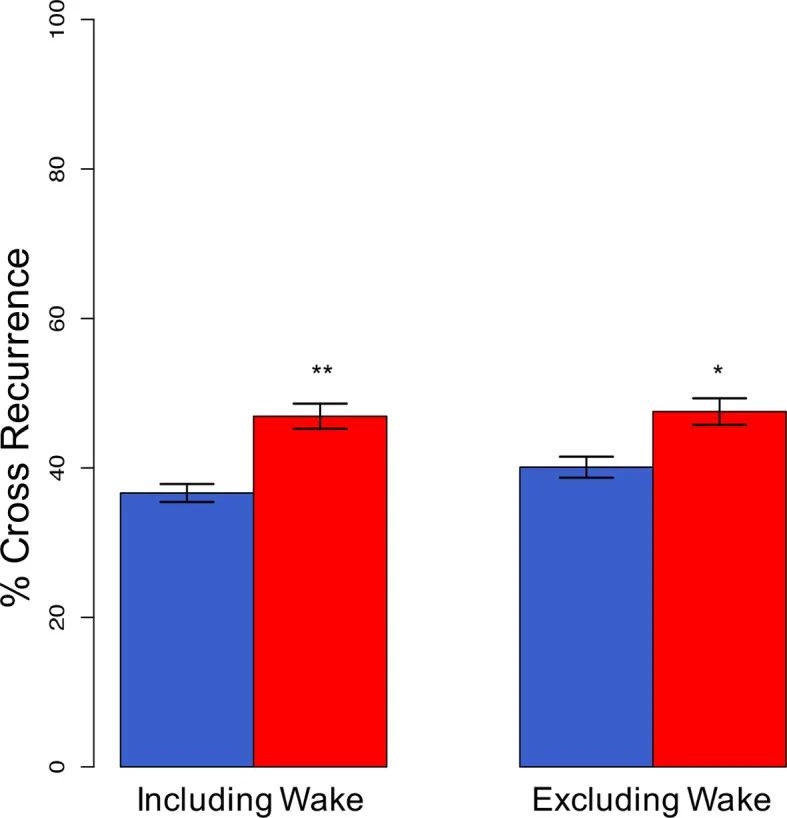 与单独睡眠(蓝条)相比,共同睡眠(红条)中睡眠阶段的完全、直接同步性显著增加,甚至近一半的夜间睡眠都是同步的,图片来源:参考文献 [1]