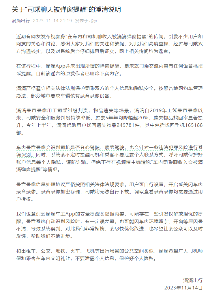 滴滴强调,绝不存在视频博主编造称“车内司乘聊收入会被滴滴弹窗提醒”等情况。