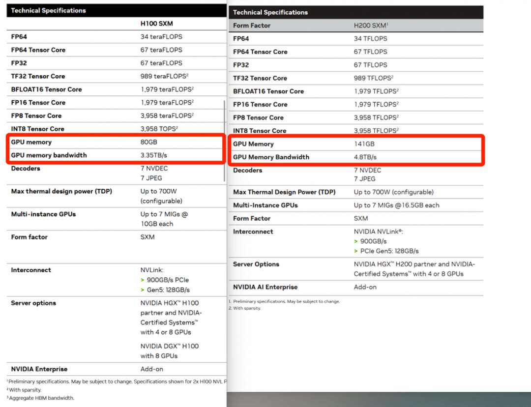 从参数方面看, H200 的主要提升就是把上一代 “ G 皇 ”H100 的显存,从 80GB 拉到了 141GB ,带宽从 3.35TB/s 增加到了 4.8 TB/s 。
