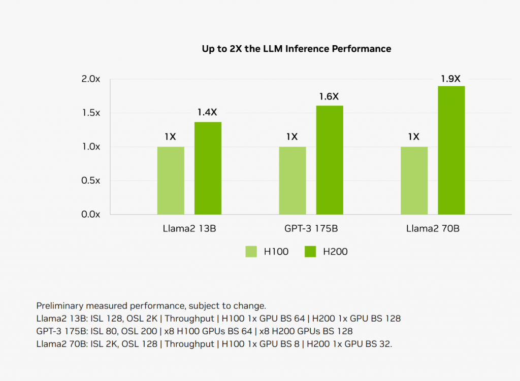 以 700 亿参数的 LLama2 大模型为例, H200 推理速度几乎比前代的 H100 快了一倍,而且能耗还降低了一半。
