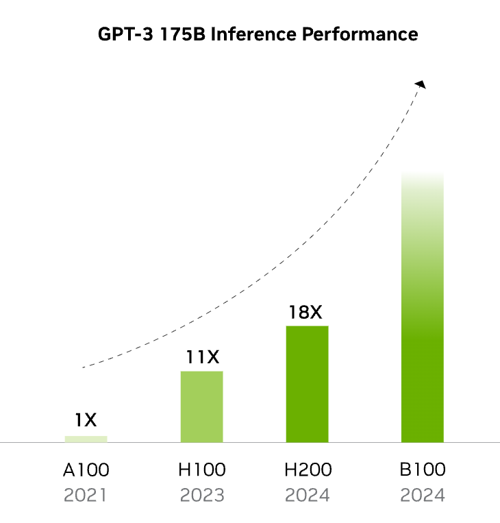 按照英伟达自己放出的消息,大的还是明年会来的 B100 ,从图里看它至少是有指数级的提升。