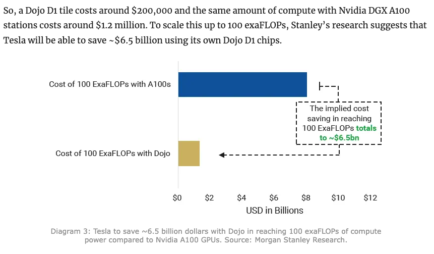 当时摩根士丹利直接吹了一篇研报说:特斯拉这波下来,比用英伟达的 A100 足足省下了 65 亿美元。