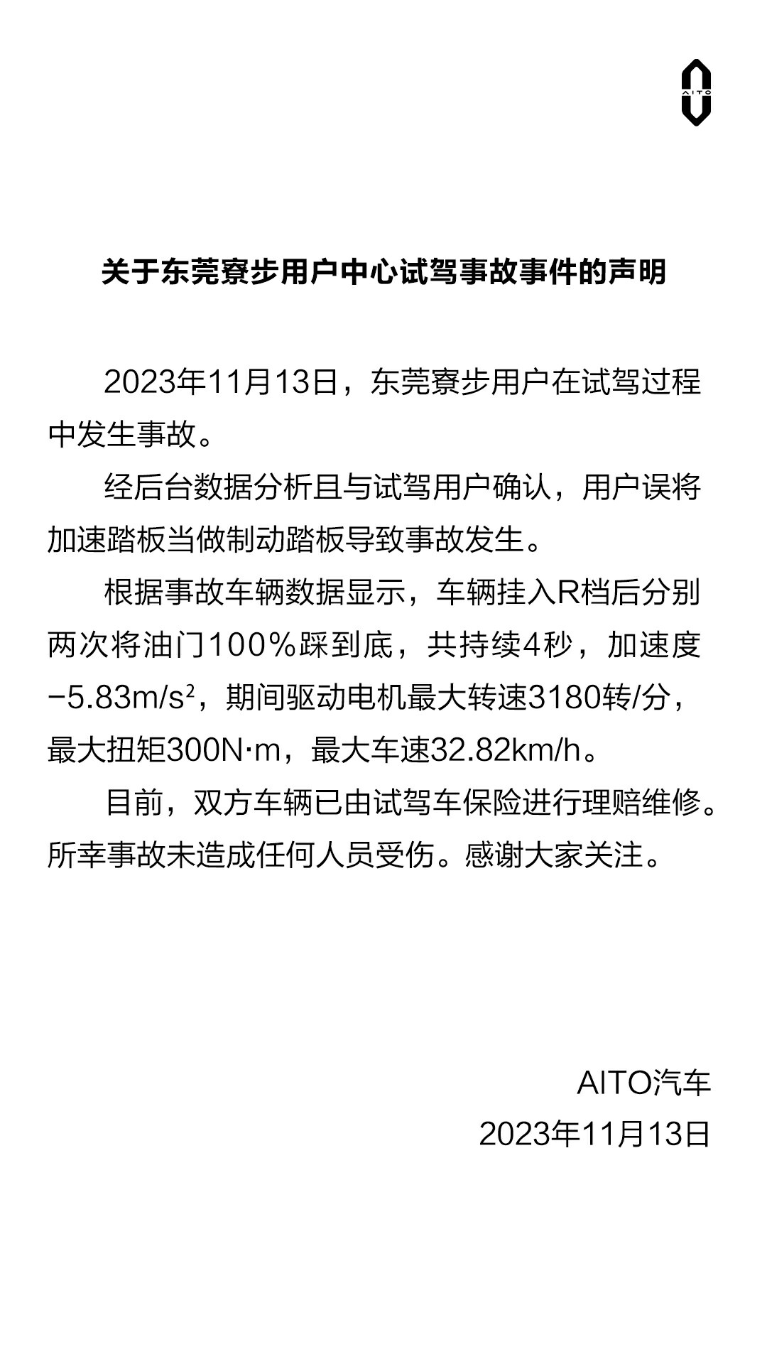 而后,AITO汽车在其官方微博发布相关声明称,“经后台数据分析且与试驾用户确认,用户误将加速踏板当做制动踏板导致事故发生。目前,双方车辆已由试驾车保险进行理赔维修。所幸事故未造成任何人员受伤。”