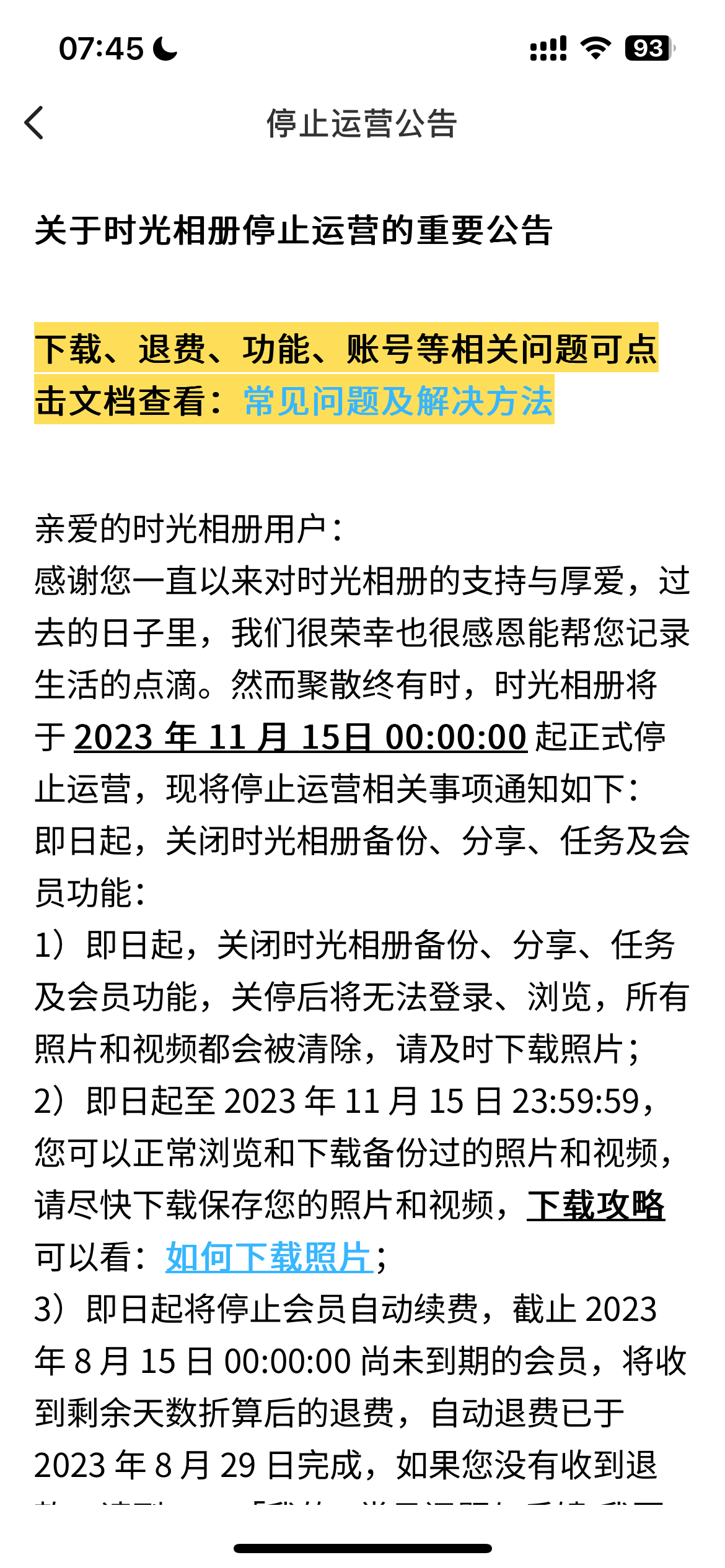 据了解,今年8月15日,时光相册宣布将于2023年11月15日00:00:00起正式停止运营。