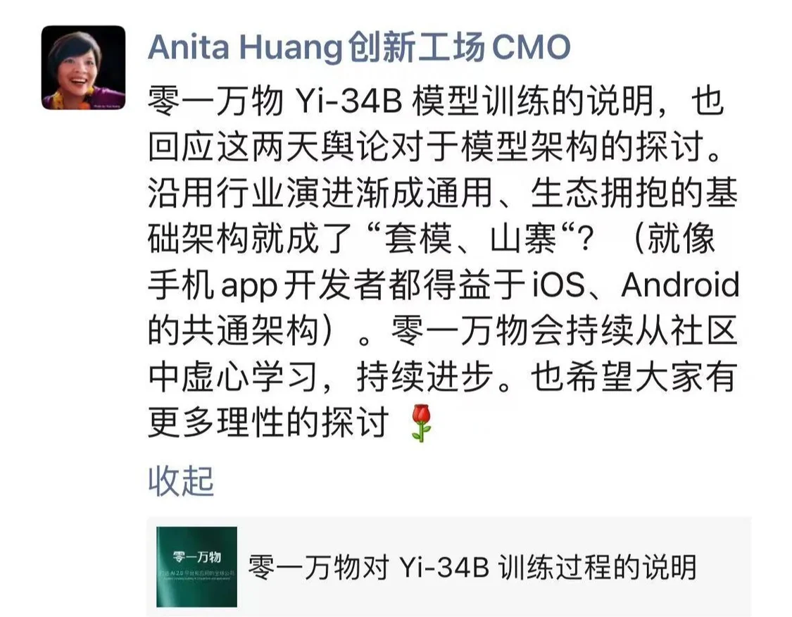 11月15日,创新工场CMO发朋友圈回应Yi大模型“抄袭LLaMA”事件,她表示零一万物发布Yi-34B模型训练的说明,回应对于模型架构的探讨舆论。创新工场CMO发文表示,沿用行业演进渐成通用、生态拥抱的基础架构就成了“套模、山寨“?(就像手机app开发者都得益于iOS、Android的共通架构)。零一万物会持续从社区中虚心学习,持续进步。