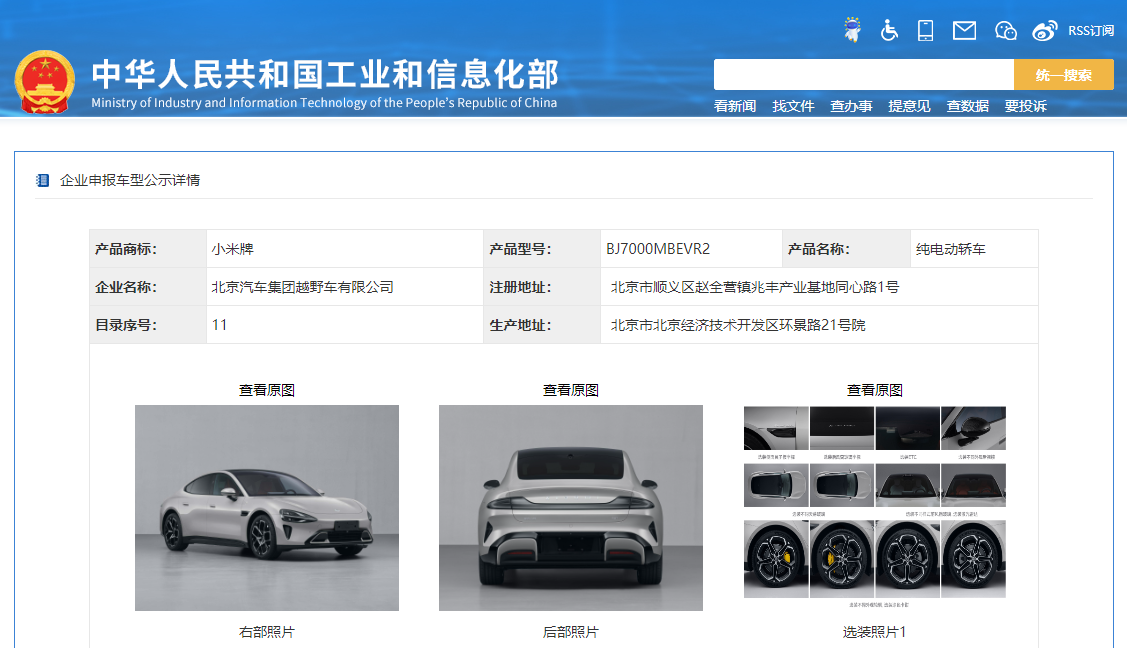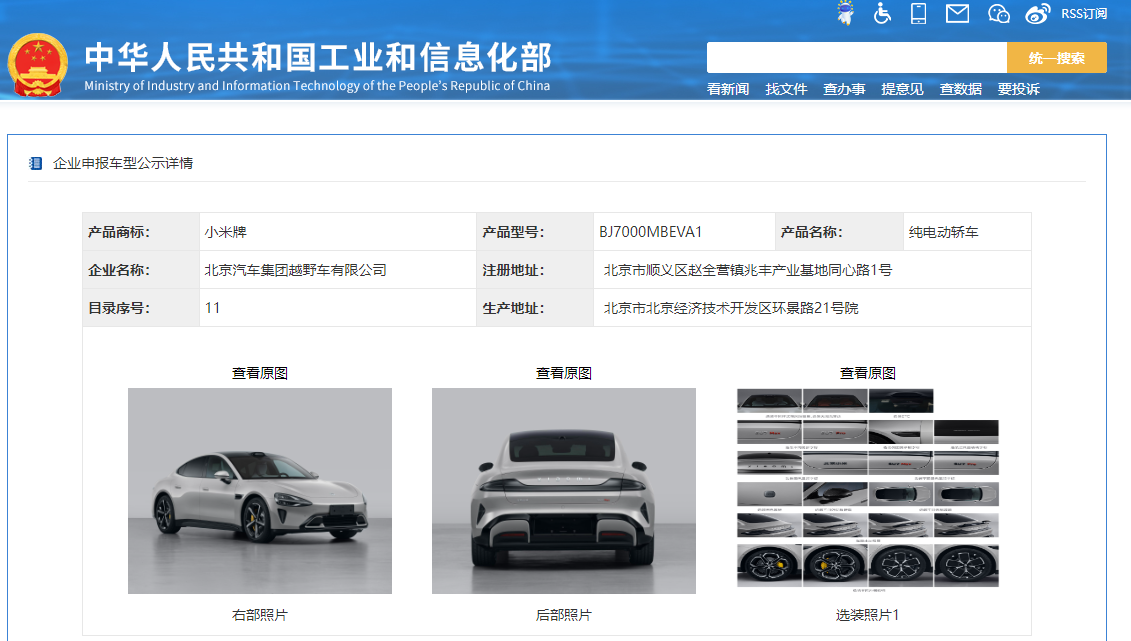 信息显示,产品商标为小米牌,企业名称为北京汽车集团越野车有限公司,注册地址为北京市顺义区赵全营镇兆丰产业基地同心路1号,生产地址为北京经济技术开发区环景路21号院。