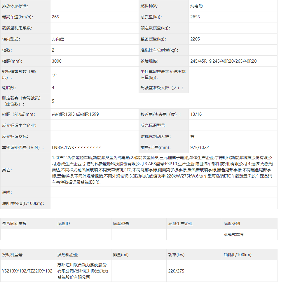 另一款纯电动轿车SU7 Max,长4997mm,宽1963mm,高1440mm;最高车速265km/h,轴距3000mm;发动机企业为苏州汇川联合动力系统股份有限公司/苏州汇川联合动力系统股份有限公司,功率为220/275kw。