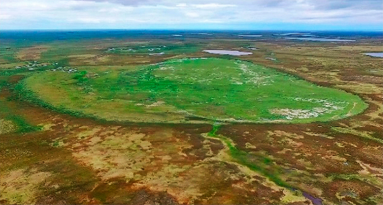 在湖泊排水后,北极植被开始在排水湖盆中定植,使地貌从裸露的湖盆沉积物逐步转变为苔原。由于排水湖盆比周边区域要更加湿润且泥土中富含营养元素,植被在排水湖盆中快速生长,迅速达到周边植被的绿度水平,并且可能会向着更高产群落的方向演替。
