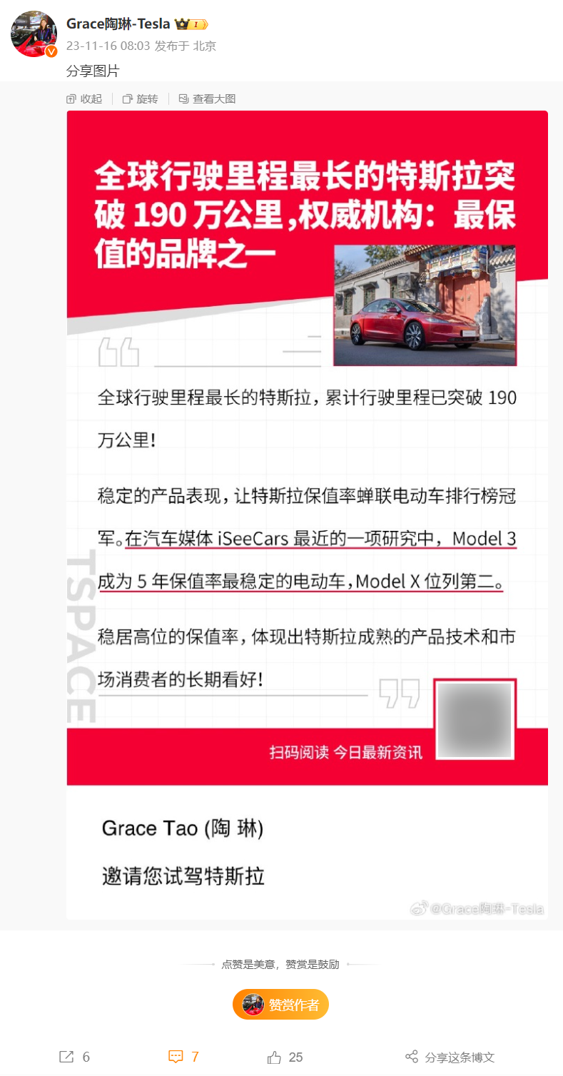 特斯拉对外事务副总裁陶琳分享图片显示:全球行驶里程最长的特斯拉诞生,其累计行驶里程已突破190万公里。稳定的产品表现,让特斯拉保值率蝉联电动车排行榜冠军,在汽车媒体iSeeCars最近的一项研究中,Model 3成为5年保值率最稳定的电动车,Model X位列第二。