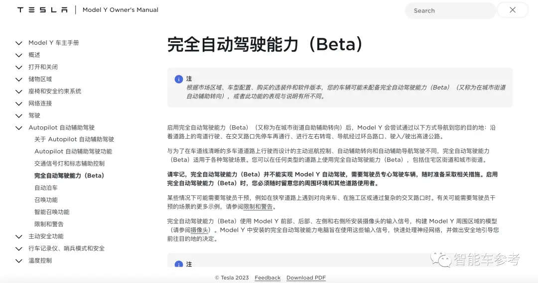 随后就有媒体发现,完全自动驾驶能力(Beta)的功能已经出现在中国官网发布的车主手册里。