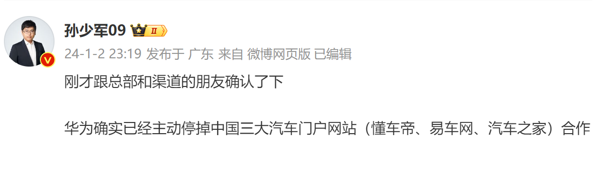 有相关博主爆料,华为确实已经主动停掉中国三大汽车门户网站(懂车帝、易车网、汽车之家)合作 。从网友晒出的帖子看,随着上述三大平台合作费用的不断提高,引起了经销商的不满,而虽然2024年三车平台基本维持了一年的会员价格并没有涨价,但车企依然不买账。