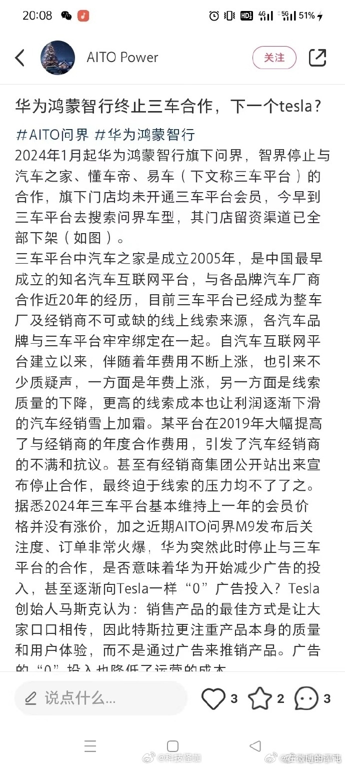 近期问界M9发布后关注度和、订单非常火爆,华为突然此时停止与三车平台的合作,是否意味着华为开始减少广告的投入,甚至逐渐像特斯拉一样“0”广告投入呢?