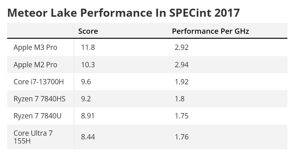 硬件爱好者David Huang测试的数据显示,SPECint 2017项目中,酷睿Ultra 7 155H的单位频率性能仅为1.76,相比于13代酷睿i7-13700H 1.92反而降低了大约8%。