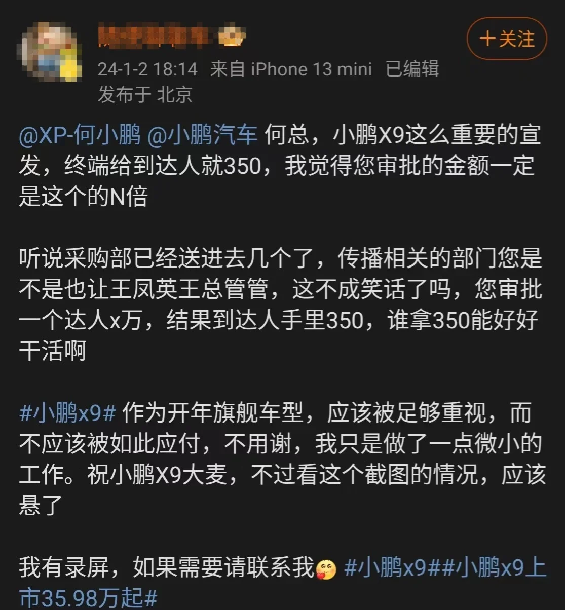 何总,小鹏X9这么重要的宣发,终端给到达人就350,我觉得您审批的金额一定是这个的N倍。