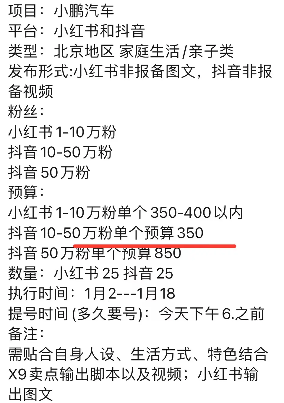 汽车博主发布截图显示,小鹏汽车招募小红书和抖音达人推广。预算为小红书1-10万粉单个350-400以内、抖音10-50万粉单个预算350、抖音50万粉单个预算850。但据博主爆料,何小鹏审批的金额,应该是一个达人x万。博主还表示,自己手中有录屏。