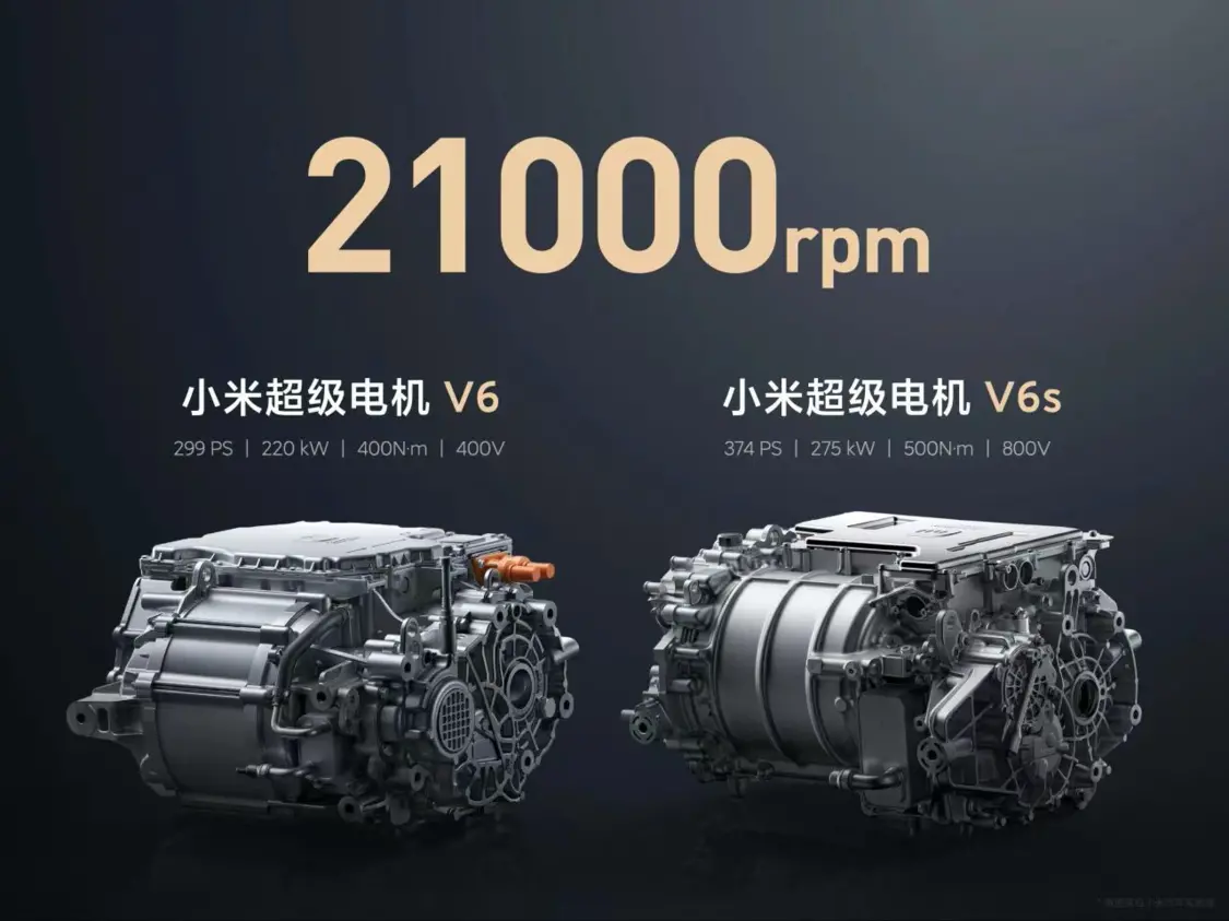 雷军表示:“电动车最核心的技术就是电机,电机直接决定了车的性能。”目前汽车行业都在卷电机的转速,小米“立志做转速最快的电机”,推出了转速高达21000rpm(revolutions per minute,即转/分钟)的小米超级电机V6/V6s以及完全自研的转速高达27200rpm的小米超级电机V8s。