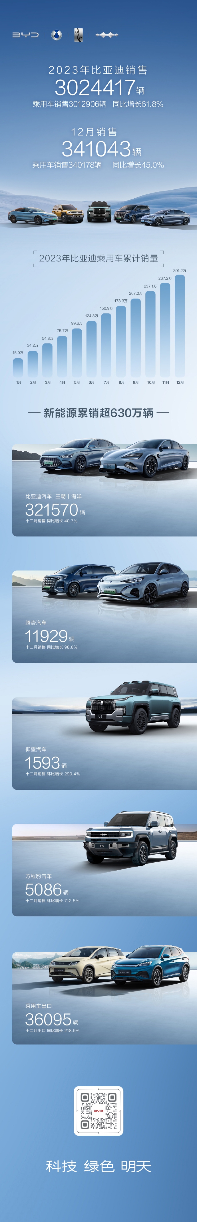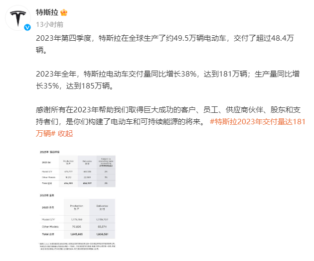 据@特斯拉官微消息,2023年第四季度,特斯拉在全球交付超过48.4万辆电动车。2023年全年,特斯拉电动车交付量达到181万辆。比亚迪公布数据显示,2023年第四季度纯电车销量为52.64万辆电动车,2023年全年纯电车交付量达到157.48万辆。