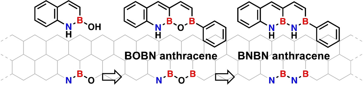 具体而言,研究人员在蒽骨架的锯齿形边缘引入多个主族杂原子,合成BOBN蒽和BNBN蒽衍生物。BNBN蒽包含一个连续的BNBN单元,该单元是由BOBN单元在锯齿边缘转化而成的。