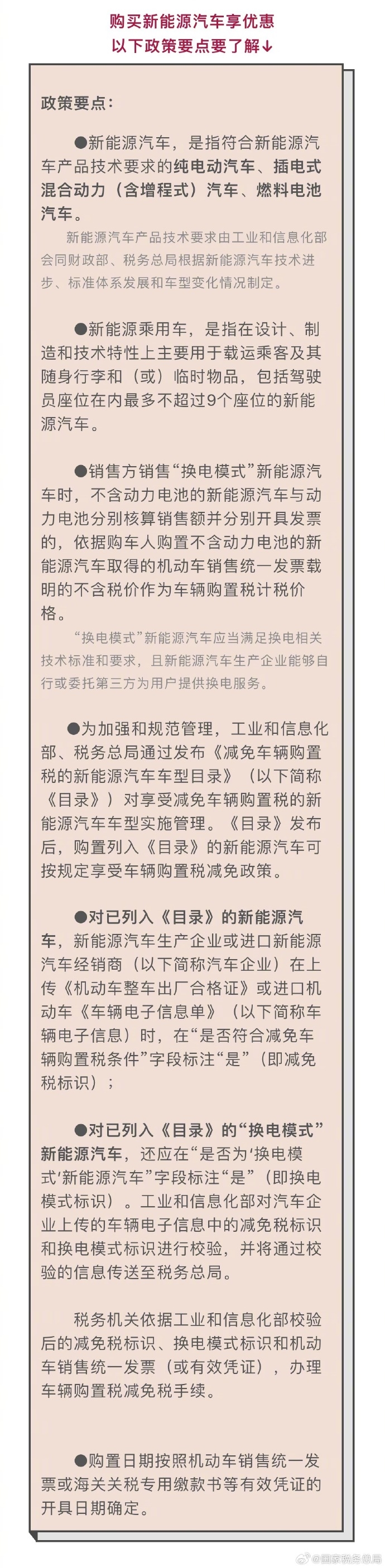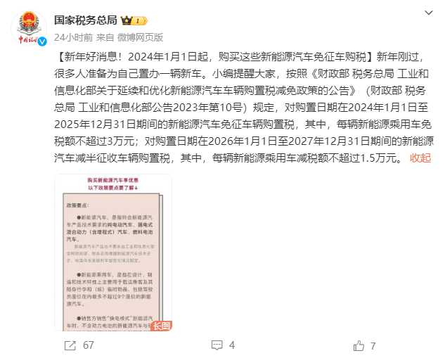据@国家税务总局官微消息,2024年1月1日起,购买一些新能源汽车可免征车购税。据介绍,购买新能源汽车享优惠的政策具体如下: