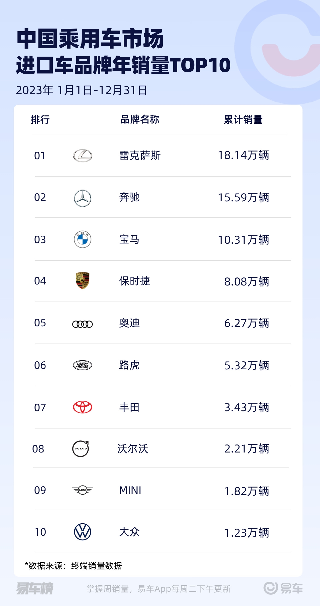 易车网公布了2023年中国乘用车进口车品牌销量榜,Top10阵营中,覆盖了国内主流进口车品牌。具体来看,虽然今年品牌销量遇冷,但丰田的高端品牌雷克萨斯仍以18.14万辆的成绩,拿下了中国进口车“冠军”。