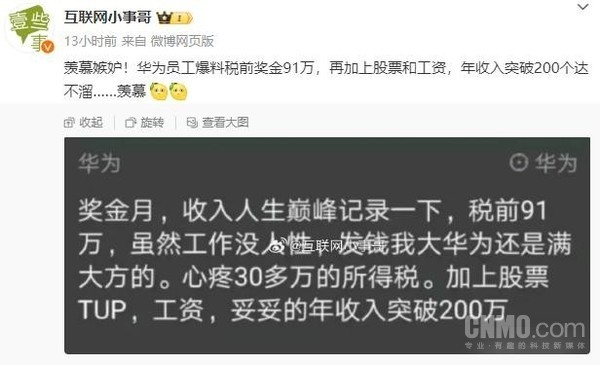 1月13日消息,有博主放出的图片,一名疑似华为员工晒出了自己在奖金月的收入情况。据悉,这是该员工“收入人生巅峰”,税前奖金为91万,所得税超过30多万,加上股票TUP、工资,“妥妥的年收入突破200万”。该员工表示,“我大华为发钱还是蛮大方的”。