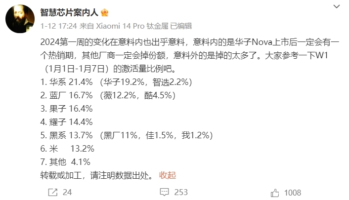 据多方消息,2024年第一周,华为手机重回中国市场销量第一,份额达19.2%。近期上市的nova 12系列成为拉动华为手机销量的主力推手。在Mate 60系列供货不足的情况下,搭载麒麟芯片的华为nova 12系列实现了开售即现货。