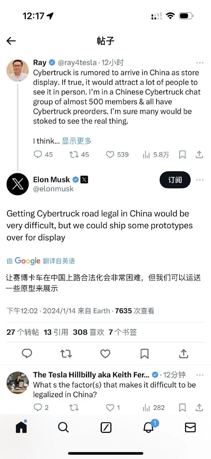 对此,马斯克回应称,让Cybertruck在中国合法上路会非常困难,但我们可以运送一些车型进行静态展示。