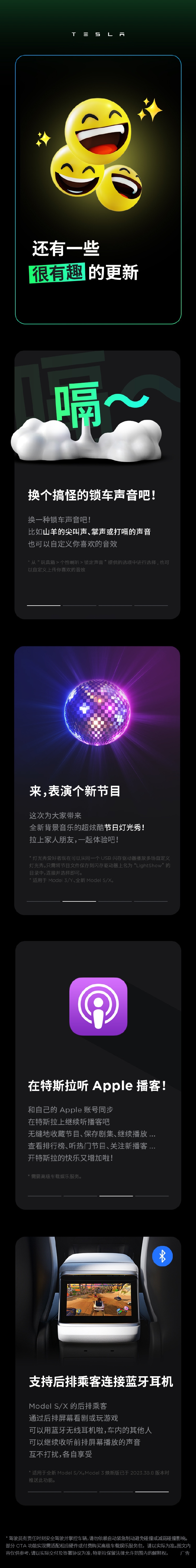 此外,新版OTA还带来了搞怪的锁车声音、节日灯光秀以及多款新游戏。