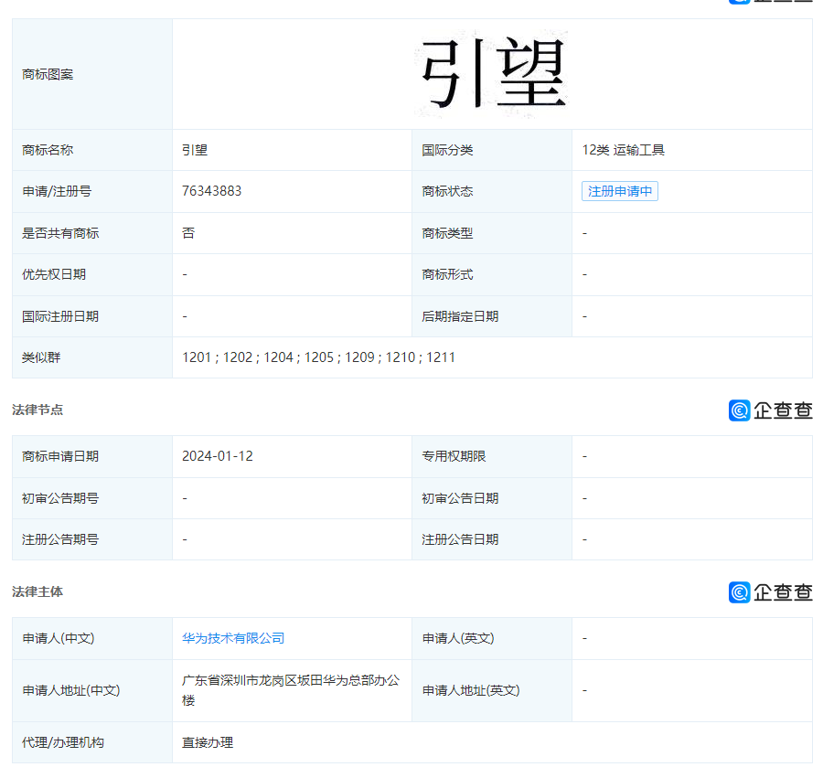 据天眼查显示,近日,华为技术有限公司申请注册了多枚“引望”“引看”“引众”“INVISOL”“INNOWARD”等商标。这些商标国际分类包括科学仪器、运输工具等,当前商标状态均为等待实质审查。