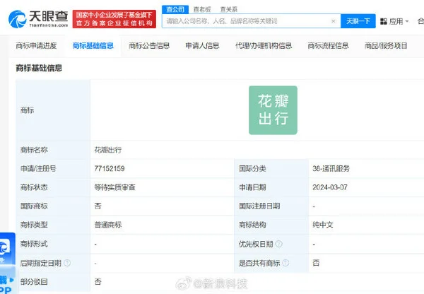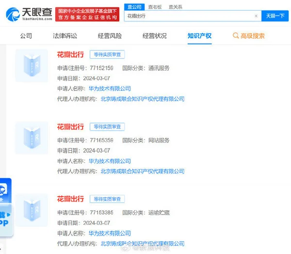 天眼查知识产权信息显示,华为技术有限公司申请注册了3枚“花瓣出行”商标,国际分类涵盖了通讯服务、网站服务以及运输贮藏等领域。目前,这些商标的状态显示为等待实质审查。据了解,华为此次申请的“花瓣出行”商标,是继“花瓣链”“花瓣地图”“花瓣支付”“花瓣翻译”“花瓣搜索”“花瓣专利”等一系列花瓣系列商标之后的又一动作。