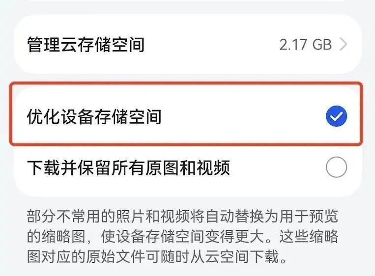 只要你开启 ” 优化设备存储空间 ” ,系统就会自动根据手机空间余量、当前使用习惯、手机功耗等综合因素选择最优空间释放方案,像极了一个全自动化的收纳师。