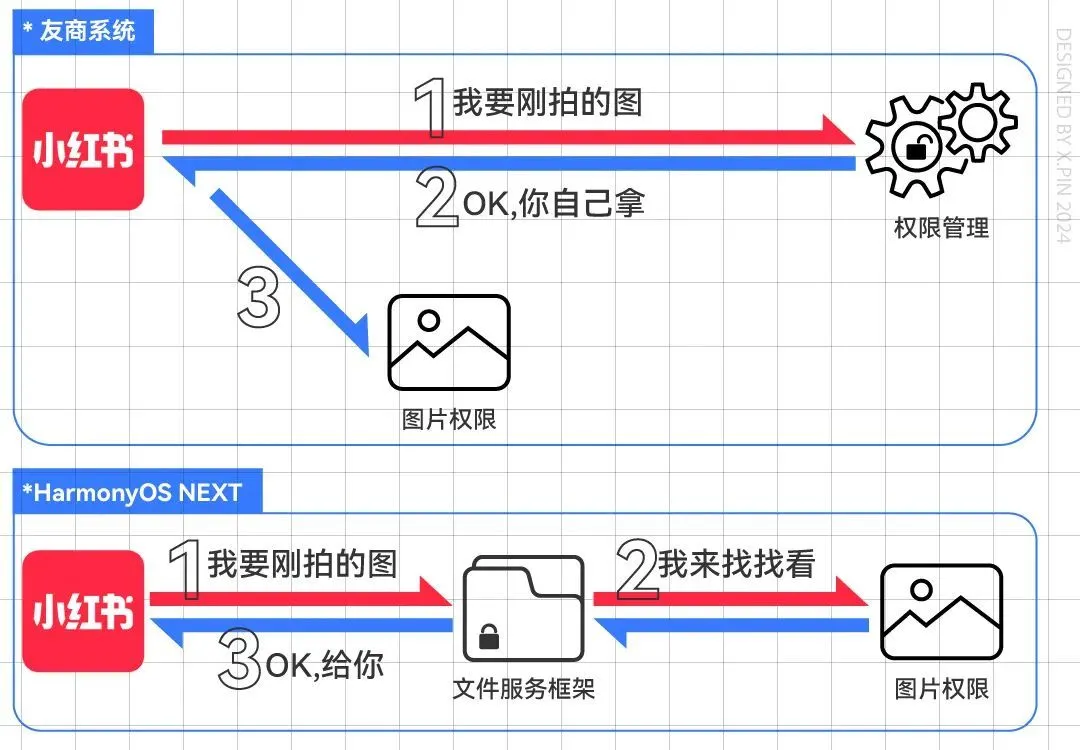 用户在小红书上选一张照片发动态,在以前只能是系统给小红书一整个读写的权限,好比给一把钥匙,应用就能看到全部内容。而在 HarmonyOS NEXT 上,系统不会再开放一个完整的权限,而是在用户单次授权下,小红书自己 “ 说 ” 要哪一张,系统再让文件服务框架中的照片选择器( photo picker )去把这张照片找出来给到小红书。