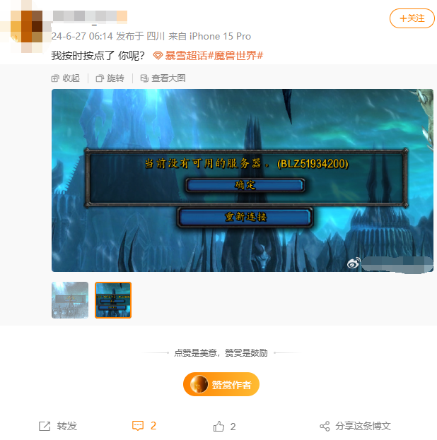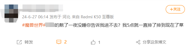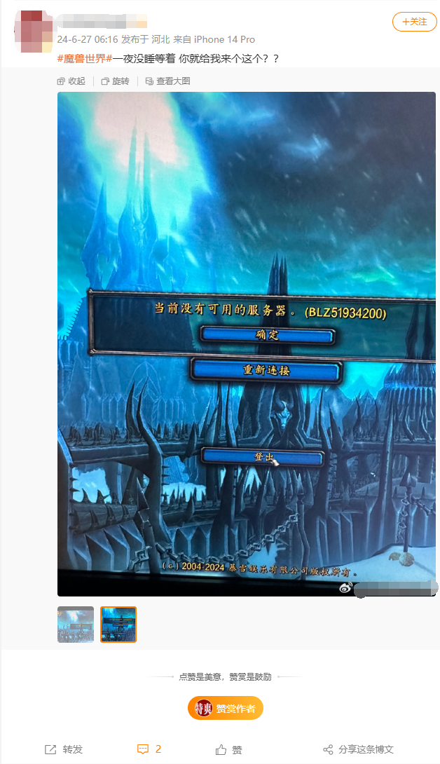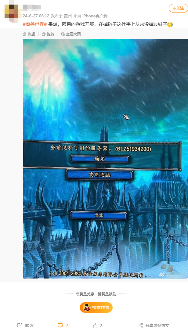 《魔兽世界》国服“巫妖王之怒”于今天早上6:00开启,全新PVP服务器“吉安娜”与“死亡猎手”同步开放。然而,在微博#魔兽世界#词条中,许多玩家发文吐槽,称自己一早就准备登录游戏,结果到点服务器却进不去。