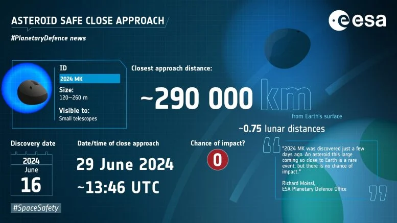 2024 MK 对于近地天体(NEO)来说是个大天体,将在距离地球表面 290,000 公里(180,000 英里)的范围内经过,大约是地球与月球之间距离的 75%。