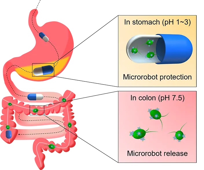 患者(会)先吞下一粒胶囊,里面装满了悬浮在载液中的微型机器人。由于其配方,胶囊的外壳在胃中保持完整,直到达到结肠的中性 pH 值才会溶解。一旦溶解,微型机器人就会释放出来。