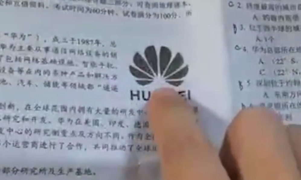 近日,有家长发视频称,其儿子参加的常州市初中地理结业会考试卷出现多个涉华为题目。此外,试卷的第一页,还印上了华为企业商标,题目包括提问华为总部所在地深圳市的经纬度,题目背景还包括华为在汽车领域和手机领域的介绍。