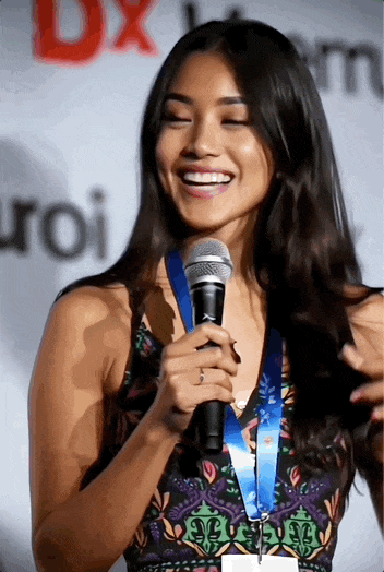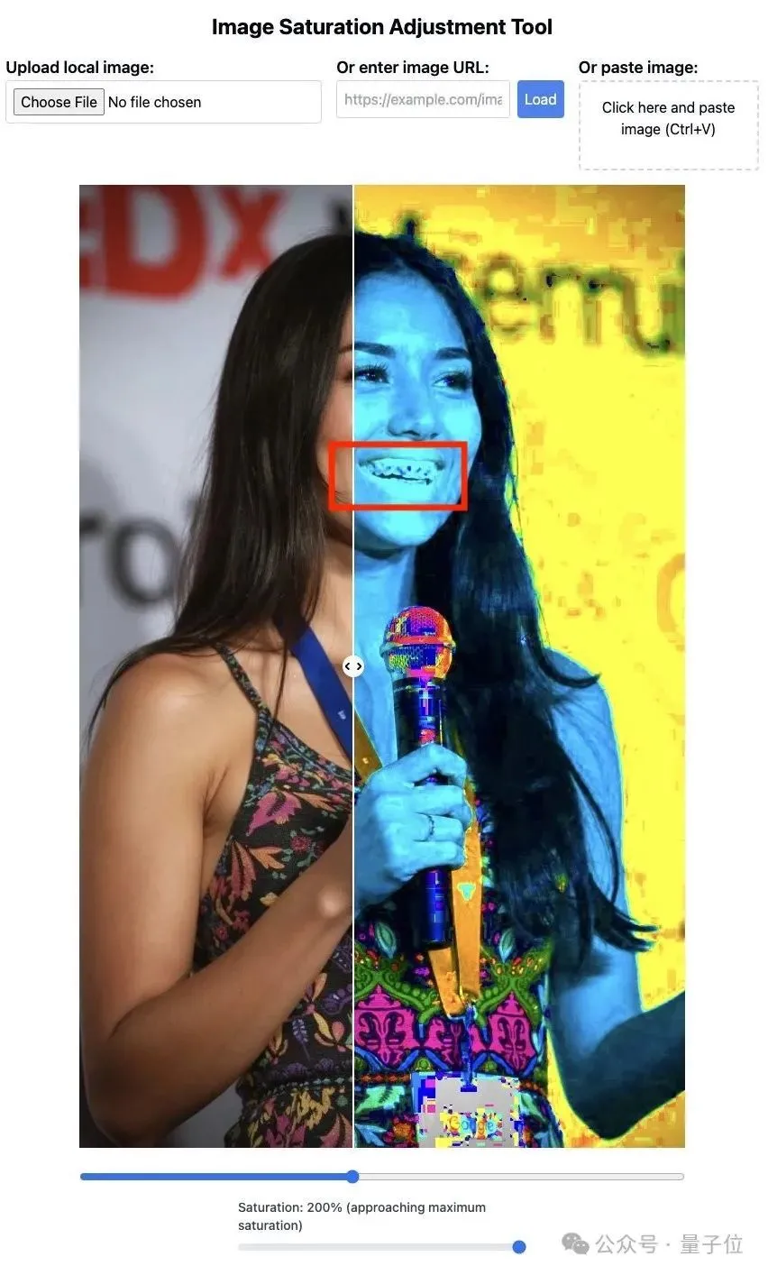 赛博照妖镜下,AI美女全变鬼。来看它的牙。把图像饱和度拉满,AI人像的牙齿就会变得非常诡异,边界模糊不清。整体图片的颜色也正常,麦克风部分更是奇怪。对比真实人类照片,则应该是这样的。牙齿是清晰的,图片色块都是均匀一致的。