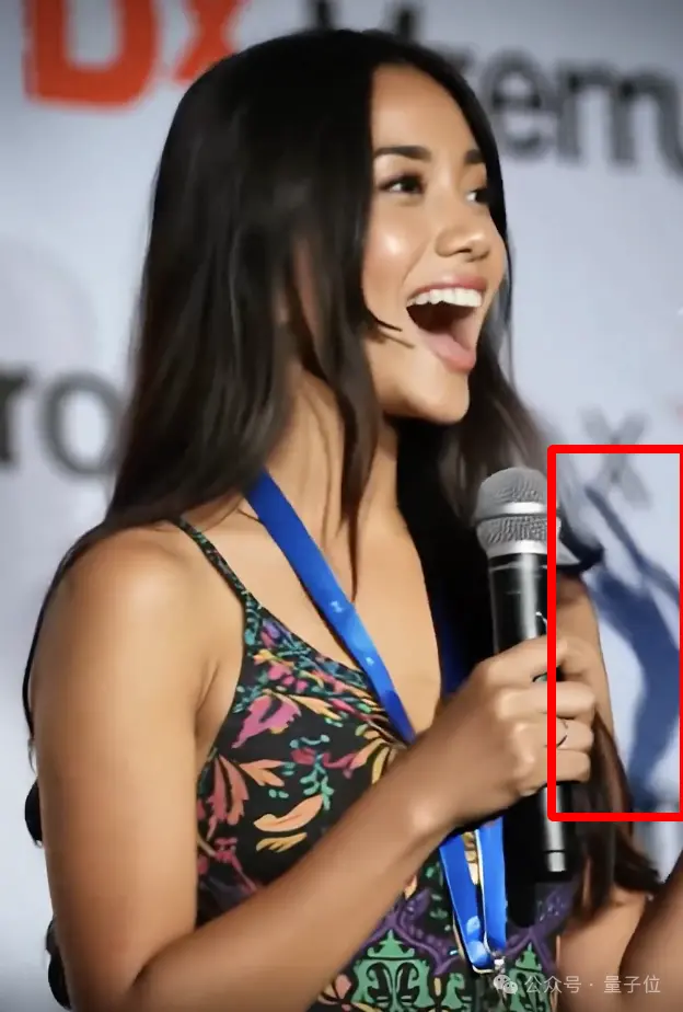 在话筒右侧的位置,有一片十分诡异的阴影,这片阴影对应的是人物的一只手,显然AI在这里处理得有所欠缺。