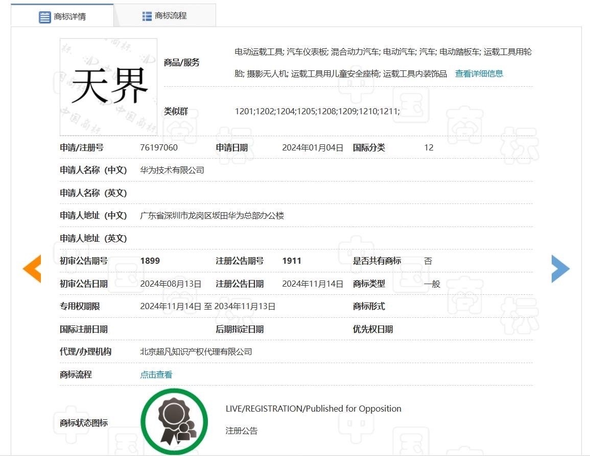 国家知识产权局商标局信息显示,华为又一批汽车类商标注册成功。商标详情页面显示,华为注册成功的“仙界、天界、君界”商标,均于今年1月4日申请,注册公告日期为11月14日。