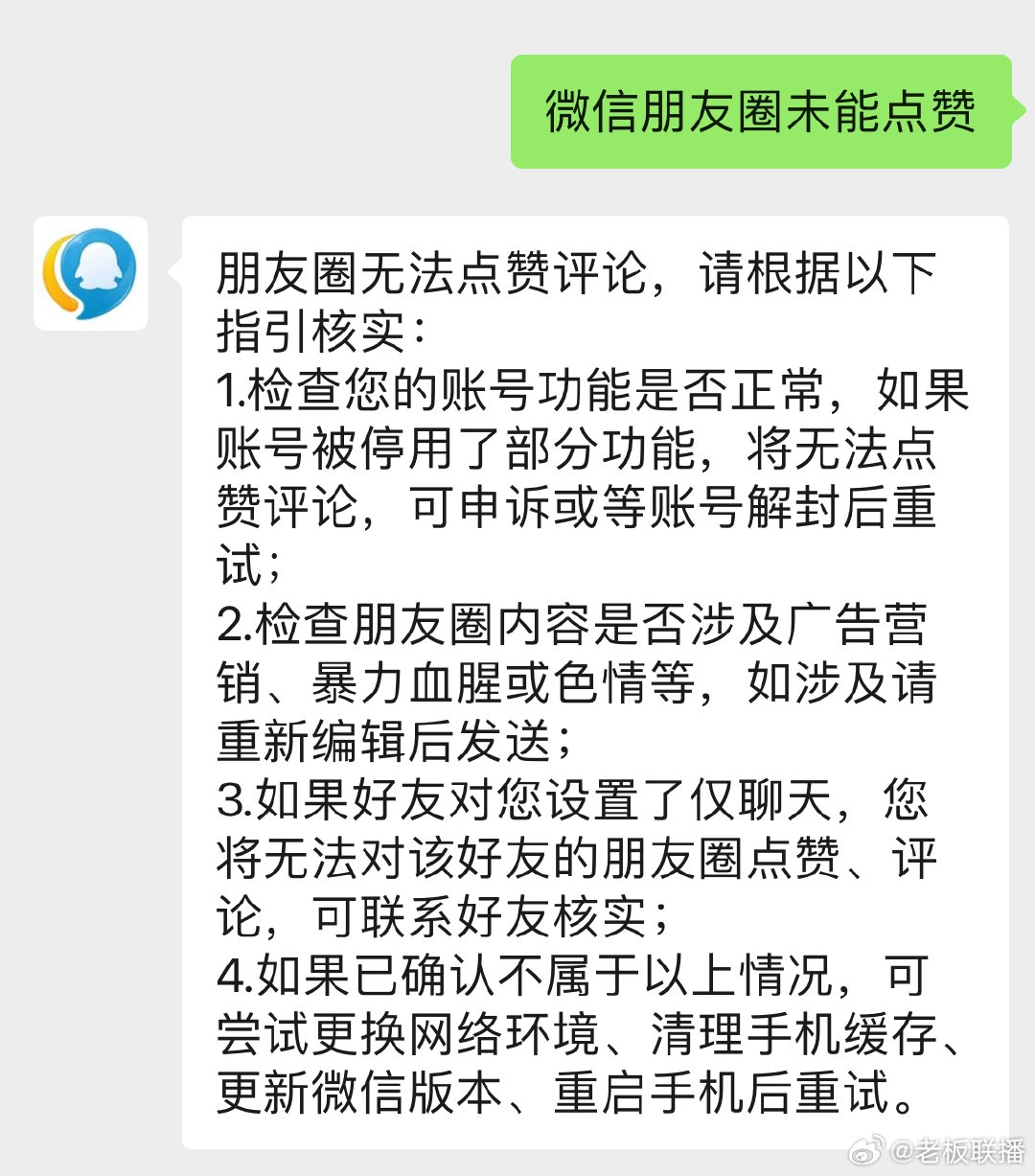 微博话题“微信朋友圈显示未能点赞”冲上热搜榜,引发关注。一名网友称,他给好友的朋友圈背景点赞,显示未能点赞跟该内容已删除,仔细一看原来是被好友删了。对于朋友圈无法点赞的情况,腾讯客服回应称请根据以下指引核实:
