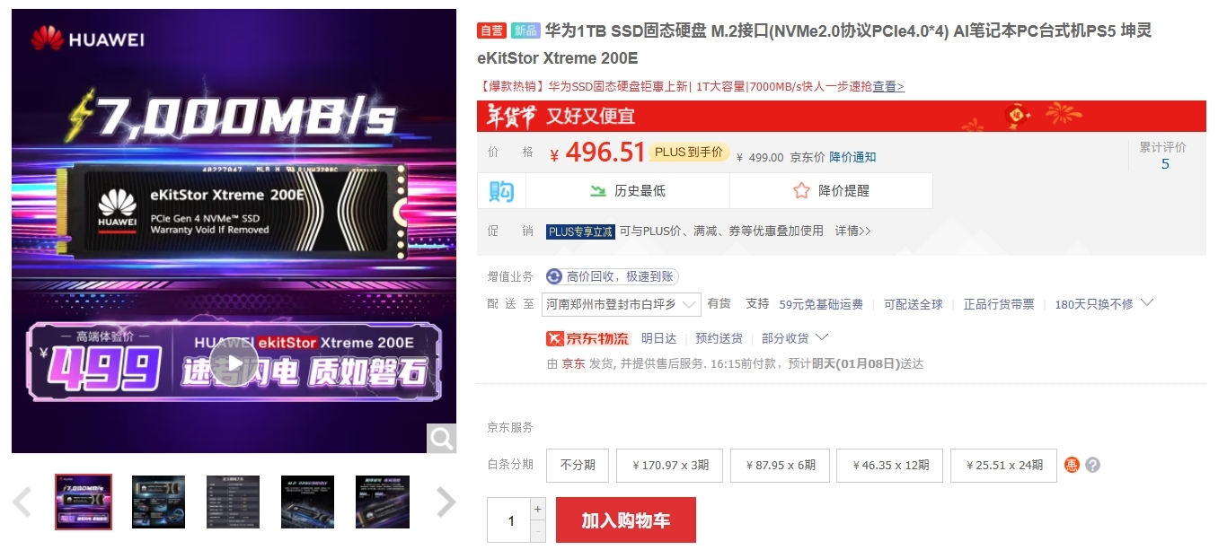 华为近期在京东上线了首款SSD固态硬盘,是刚刚发布的新品——坤灵eKitStor Xtreme 200E。目前只上架了1TB版本,售价499元,将在明天上午10点正式开售。