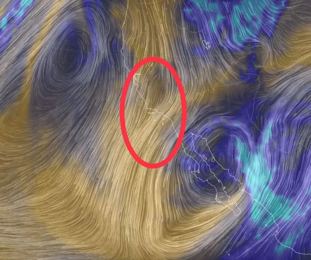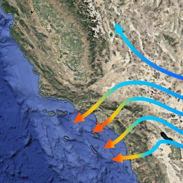 具体而言,每年冬季,当北美中西部落基山区/大平原等地出现寒潮时,会给西侧加利福尼亚等地带来明显的东北风。