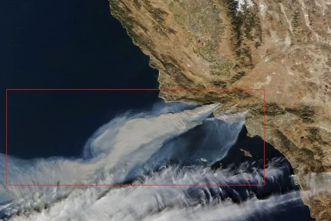 摄于 2017 年 12 月 5 日的卫星图,红框部分是山火所形成的烟雾